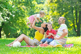 Szczęśliwa młoda para z dziećmi zabawy w parku