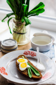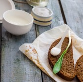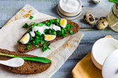 chleb żytni z dzikim czosnkiem, śmietaną i jaj przepiórczych