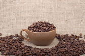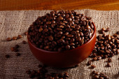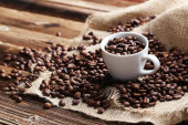 Ziarna kawy i filiżanki w misce