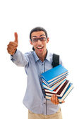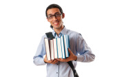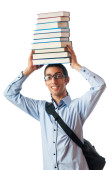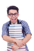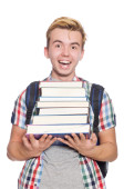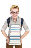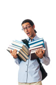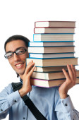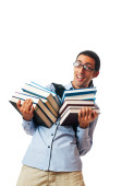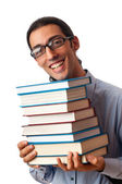 student z stos książek na biały