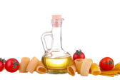 surowy makaron i jedzenie warzywo na białym tle i cherie