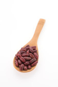 Czerwona fasola adzuki w drewnianej łyżeczce izolowana na białym tle. Widok góry. Układy płaskie