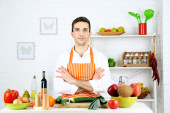 Zdjęcie "Człowiek przy stole z różnych produktów i szkło w kuchni na ścianie białe tło" może być wykorzystywane do celów osobistych i komercyjnych zgodnie z warunkami zakupionej licencji Royalty-free. Obraz jest dostępny do pobrania w jakości wysokiej rozdzielczości do 5760x3840.