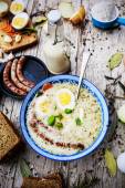 Zdjęcie "Tradycyjny Polski Żurek krem z jajkiem i kiełbasą" może być wykorzystywane do celów osobistych i komercyjnych zgodnie z warunkami zakupionej licencji Royalty-free. Obraz jest dostępny do pobrania w jakości wysokiej rozdzielczości do 5760x3840.