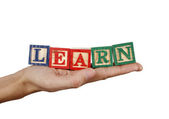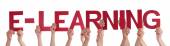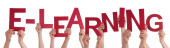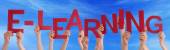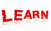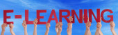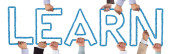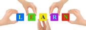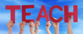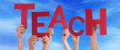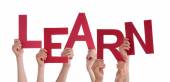 Wielu ludzi ręce trzymając czerwony Word nauka niebieski niebo
