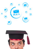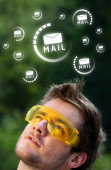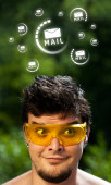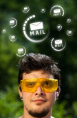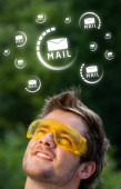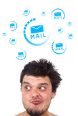 młody głowę patrząc na wsparcie kontakt typu ikony i znaki
