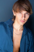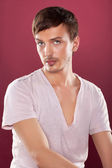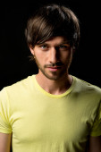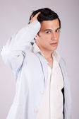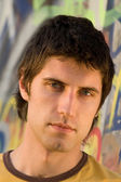przystojny mężczyzna przypadkowo opierając się o ścianę i patrząc na ca