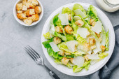 Sałatka Cezar z grillowanym kurczakiem, grzanki, jaja przepiórcze i pomidorkami