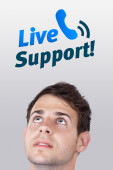 Zdjęcie "młody głowę patrząc na wsparcie kontakt typu ikony i znaki" może być wykorzystywane do celów osobistych i komercyjnych zgodnie z warunkami zakupionej licencji Royalty-free. Obraz jest dostępny do pobrania w jakości wysokiej rozdzielczości do 5760x3840.