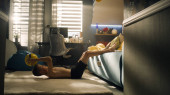 Widok kobiety leżącej na podłodze obok pustych butelek po piwie. Alkoholizm. Beznadziejność. Leczenie uzależnienia od alkoholu