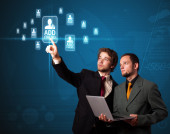 Biznesmen wciskający nowoczesne przyciski typu high tech