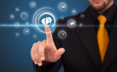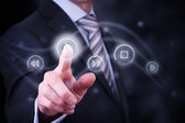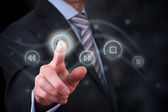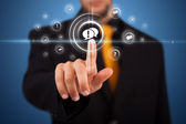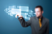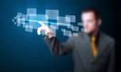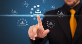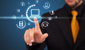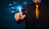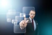 Biznesmen wciskający nowoczesne przyciski typu high tech