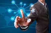 Biznesmen wciskający ikony wirtualnego komunikatora