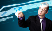 Biznesmen wciskający nowoczesne przyciski typu high tech
