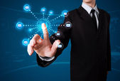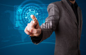 Biznesmen wciskający nowoczesne przyciski typu high tech