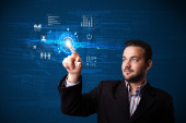 biznesmen naciskając wirtualnych promocji i wysyłki typ ikony