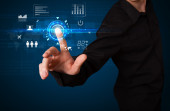 Biznesmen wciskający ikony wirtualnego komunikatora
