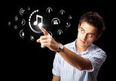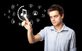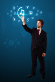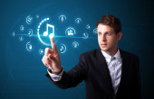 Biznesmen wciskający wirtualne media typu buttons