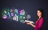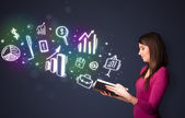 Businesswoman pressing virtual messaging type of icons