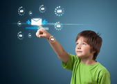 Biznesmen wciskający ikony wirtualnego komunikatora