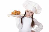 Portret dziewczynki w biały fartuch, posiadający dwa kurczaka e