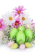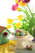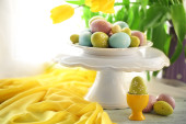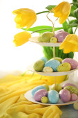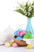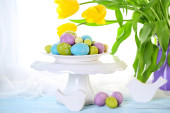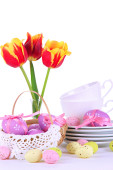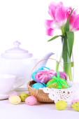 Pisanki na wazon i tulipany na stole na jasnym tle