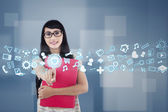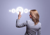 Bizneswoman wciskająca wirtualne media typu buttons