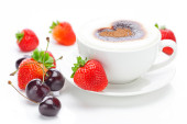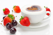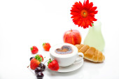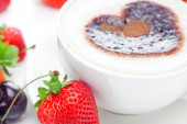 cappuccino w Puchar w kształcie serca, wiśnia, rogalik i