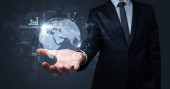 Biznesmen wciskający nowoczesne przyciski typu high tech