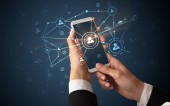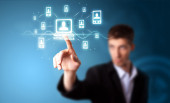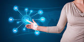 Businesswoman pressing modern social type of icons