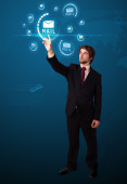 Biznesmen wciskający ikony wirtualnego komunikatora
