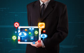 Biznesmen wciskający ikony wirtualnego komunikatora