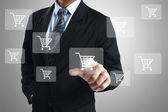 biznesmen naciskając wirtualnych promocji i wysyłki typ ikony