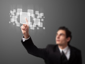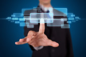 Biznesmen wciskający nowoczesne przyciski typu high tech