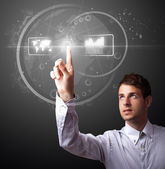 Biznesmen wciskający ikony wirtualnego komunikatora