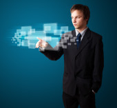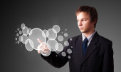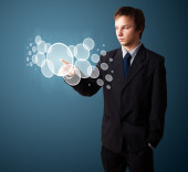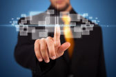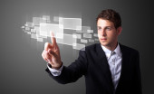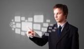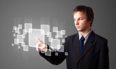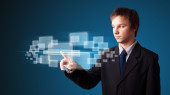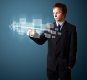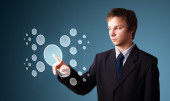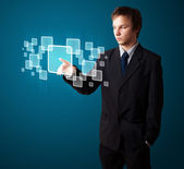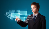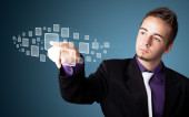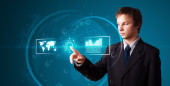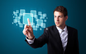Biznesmen wciskający nowoczesne przyciski typu high tech