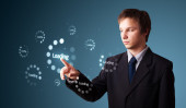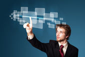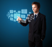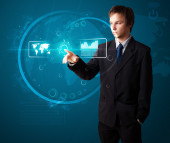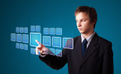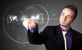 Biznesmen wciskający nowoczesne przyciski typu high tech