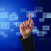 Biznesmen wciskający ikony wirtualnego komunikatora
