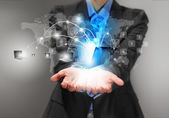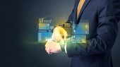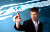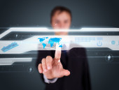 Biznesmen wciskający nowoczesne przyciski typu high tech