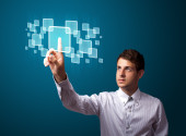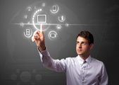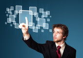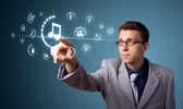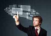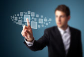 Biznesmen wciskający nowoczesne przyciski typu high tech