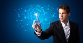 Biznesmen wciskający wirtualne media typu buttons