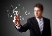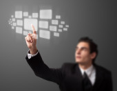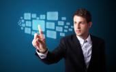Biznesmen wciskający nowoczesne przyciski typu high tech