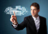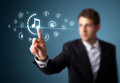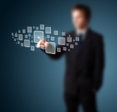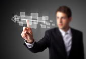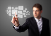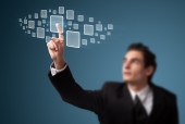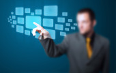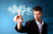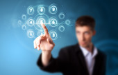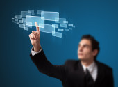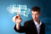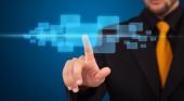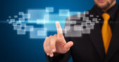 Biznesmen wciskający nowoczesne przyciski typu high tech