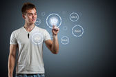 biznesmen naciskając wirtualnych promocji i wysyłki typ ikony