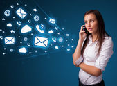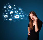 Businesswoman pressing virtual messaging type of icons