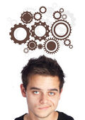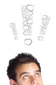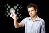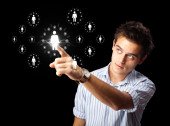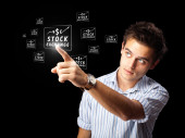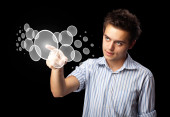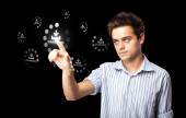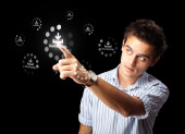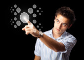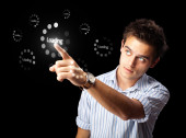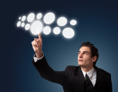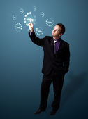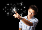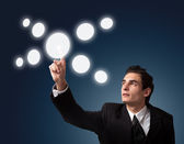 Biznesmen wciskający nowoczesne przyciski typu high tech