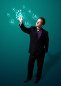 Biznesmen wciskający nowoczesne przyciski typu high tech