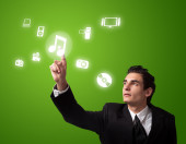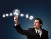 Zdjęcie "Biznesmen wciskający wirtualne media typu buttons" może być wykorzystywane do celów osobistych i komercyjnych zgodnie z warunkami zakupionej licencji Royalty-free. Obraz jest dostępny do pobrania w jakości wysokiej rozdzielczości do 5760x3840.