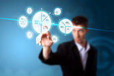 biznesmen naciskając wirtualnych promocji i wysyłki typ ikony
