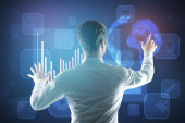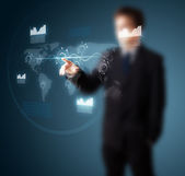 Biznesmen wciskający nowoczesne przyciski typu high tech